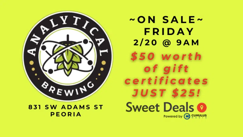 Analytical Brewing is NOW OPEN in Peoria's Warehouse District at 831 SW Adams Street! Grab your $50 Gift Certificates for just $25 with Sweet Deals! On-Sale Friday 2/20 @ 9am right HERE Enjoy the same great beer from their original Lexington location - plus a full craft taproom, kitchen, and full bar. Popular menu ite...