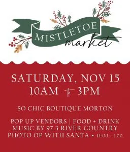 It’s the sixth year of the mistletoe market brought to you by So Chic Boutique and you don’t want to miss it. Get to downtown Morton, Saturday, November 15th from 10:00 – 3:00 and shop local, small business, all in one place.
