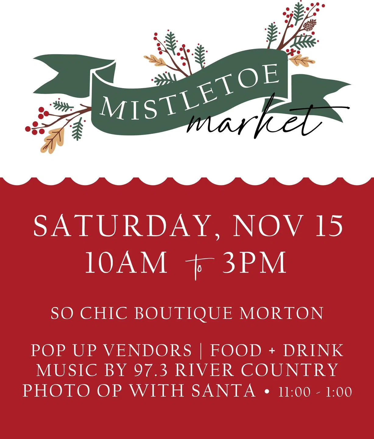 It’s the sixth year of the mistletoe market brought to you by So Chic Boutique and you don’t want to miss it. Get to downtown Morton, Saturday, November 15th from 10:00 – 3:00 and shop local, small business, all in one place.